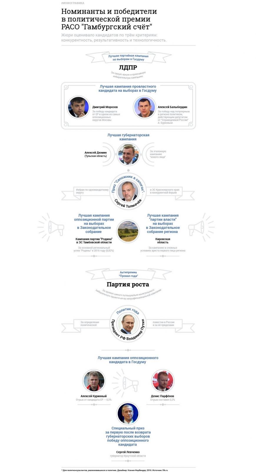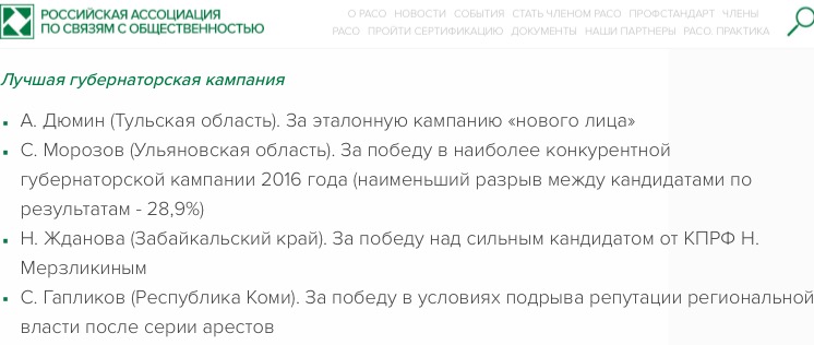 Однако стать победителем премии смог стать лишь Алексей Куринный. Сергей Морозов в своей номинации уступил губернатору Тульской области Алексею Дюмину, чью предвыборную кампанию признали лучшей среди губернаторов.