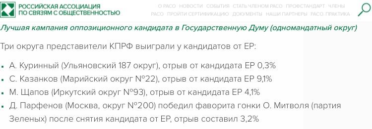 Российская Ассоциация по связям с общественностью (РАСО) на прошлой неделе представила новую политическую премию "Гамбургский счет". Данная премия присуждается политикам, партиям, политическим группам и кандидатам в России и за рубежом, которые в ходе конкурентных политических кампаний продемонстрировали при соблюдении демократических процедур результативность, технологичность и креативность.
